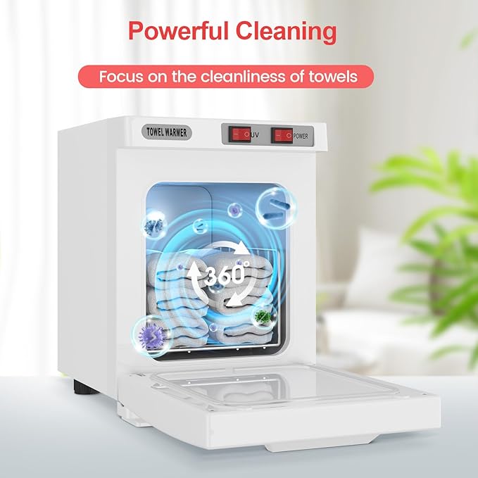 - 【Suitable Capacity】Our hot towel cabinet saves space with a size of 8.5 x 10.3 x 11.6 in. Simultaneously, It has a 5L capacity of 6-8 regular towels or 10-12 facial towels, allowing you to put enough towels in at once for commercial or family use.