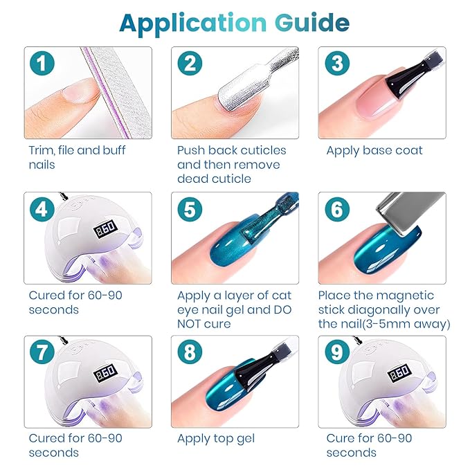 - HOME SALON QUALITY:Glitter cateye gel nail polish is good choice for use in a nail salon or nail starter at home.You can design your own manicure at home to show your style. Remember the gel polish needs to be cured under LED or UV nail lamp. Average for Nail Lamp 60-120 secs
