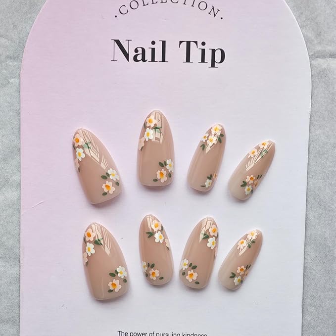 Small Flower Press on Nails Nude Full Cover Fake Nails Medium Almond False Nails with Design Spring Summer Nail Reusable Artificial Acrylic Stick on Nails for Women Manicure 24Pcs