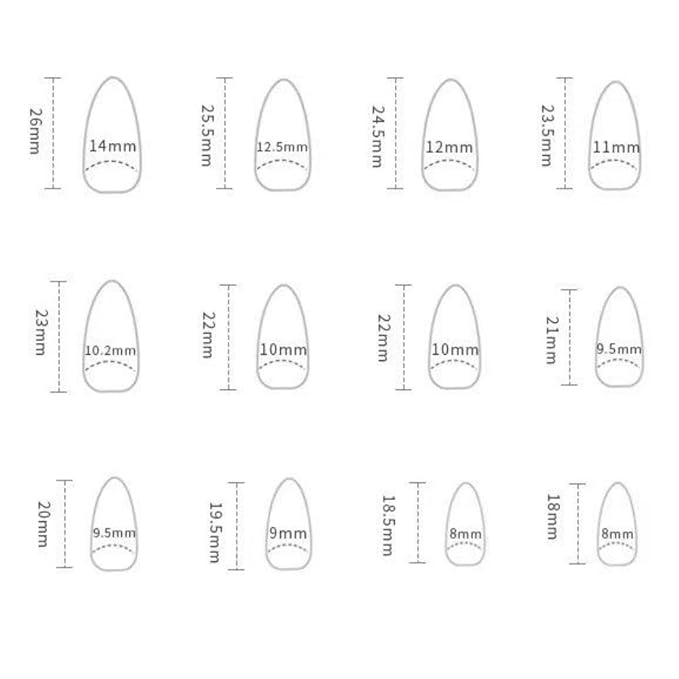 - Package About:Green false nails.The package contains 24 Pcs of short almond press on nails of different sizes,1 adhesive tabs,1 small wooden stick,and 30 pieces nail glue stickers.You can safely choose a fake nail that fits your finger size