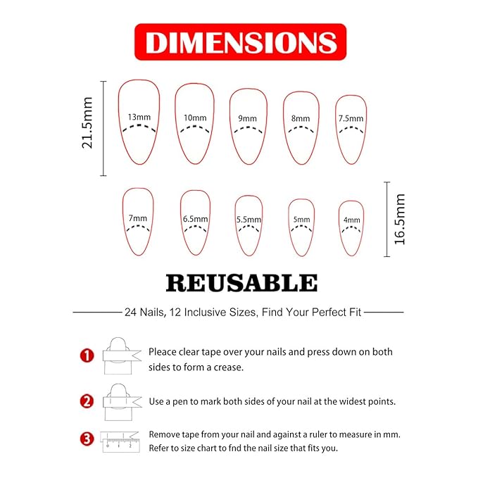 - Easy to Apply:Spring stick on nails.Trim and clean your natural nails first,choose the right size and apply our nail tape,then press on the nails for 10 seconds.A few simple steps will make it easy for you to get the effect of doing a nail salon at home.When removing the press on nails, soak the nails in water for about a minutes to remove them more easily