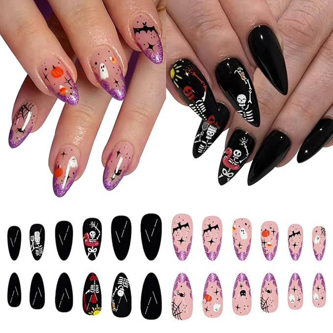 - Package Included: You will get 2 Sets Halloween meidum almond nails in 12 different sizes (48pcs in total) with 2 sheets jelly double-sided adhesive tapes and 2 Files, 2 Cuticle Stick. You can choose the suitable size to fit your finger. And they are enough to meet long-term use needs