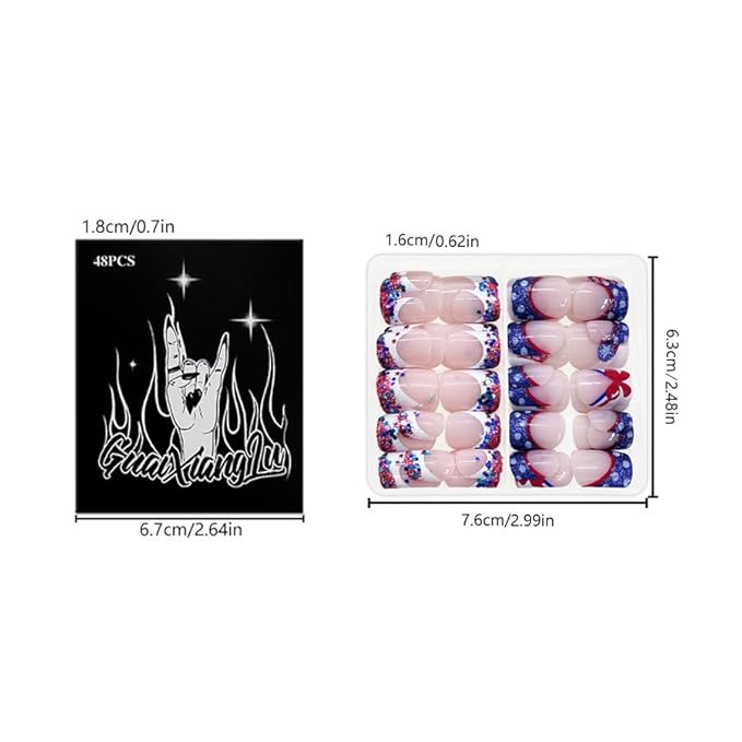 - Christmas Press on Nails: There are 48 Independence Day acrylic nails in one pack,Beautiful and fashion press on nails Square false nails comes with has 12 different sizes. Brush the nail with a coat of polish if you want it to last longer