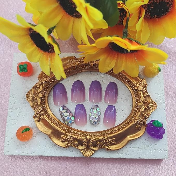 Short Coffin Press-On Nails, 24pcs Plastic Sliver Glitter Sequins Designs, Purple Gradient, Glossy, Full Cover, Quick On, 24 Fl Oz (Pack of 1)