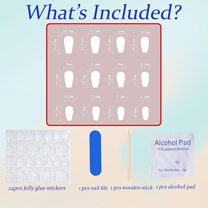 - Package Included:you will get 24pcs short press on nails,1pcs jelly glue stickers,1pcs alcohol pad,1 nail file, 1 wooden stick.