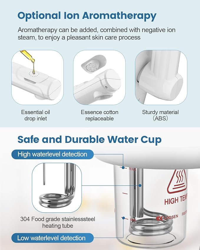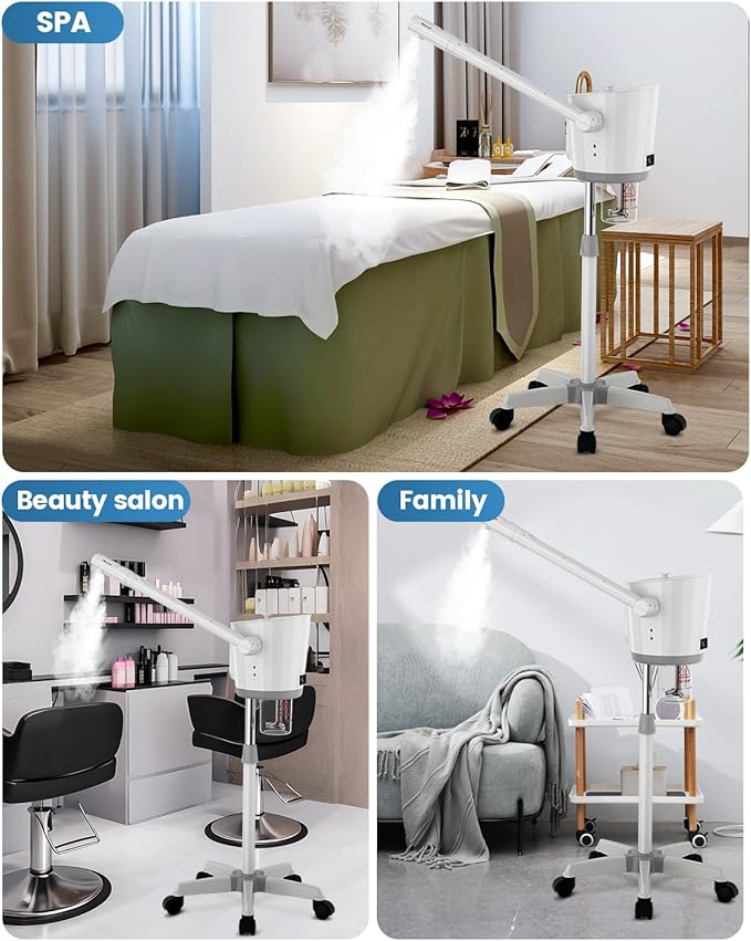 - 【Detachable, Height-Adjustable Design】With a detachable, easy-to-clean water cup and a height-adjustable stand, this steamer is built for convenience. Adjust the height and enjoy a 360° rotating nozzle, perfect for a personalized, comfortable treatment while sitting or lying down. The wheeled stand offers effortless mobility, suiting both home and salon use