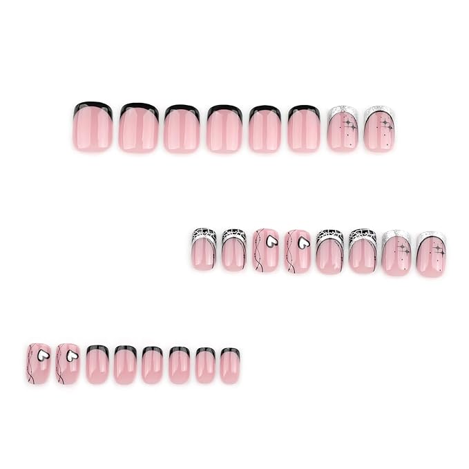 French Press On Nails Short Square, Pink Fake Nails with French Tips and Stellar Heart, Glitter Designs, Glossy Gel Finish Acrylic Short Press On Nails, Thick Reusable Glue On Nails Kit for Women