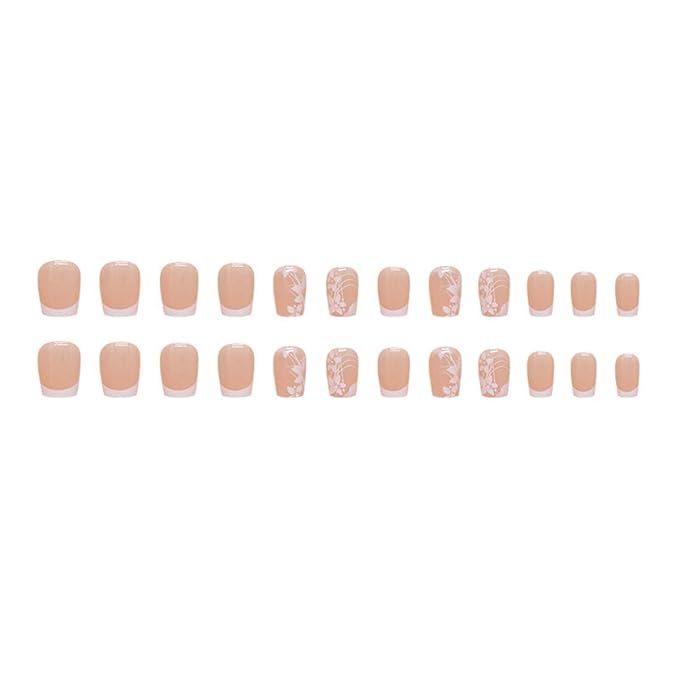 French Tip Press on Nails Square Fake Nails Short False Nails with Flower Design Nude Acrylic Nails Glue on Nails Full Cover Artificial Nails Stick on Nails Reusable for Women Manicure Art 24Pcs