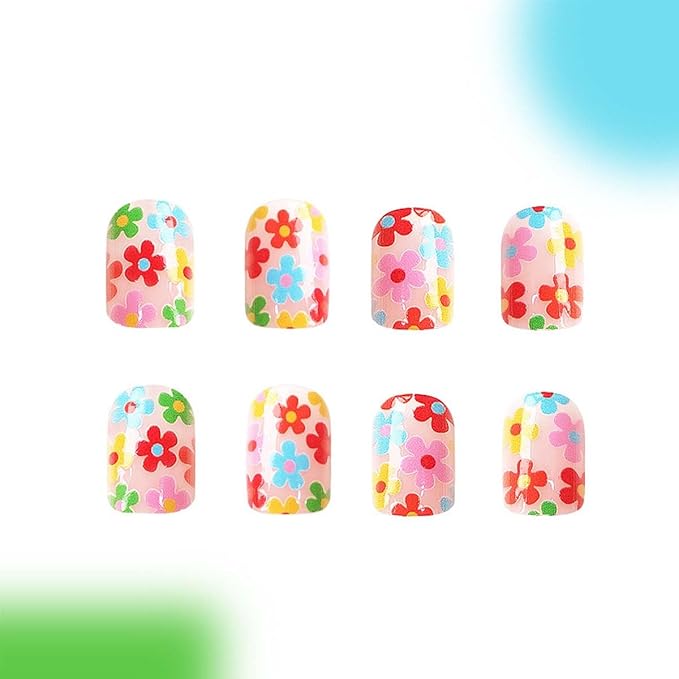 Square Press on Nails Short Fake Nails Cute False Nails with Colorful Flower Design Acrylic Artificial Nails Glossy Glue on Nails Full Cover Stick on Nails for Women Manicure Art 24Pcs