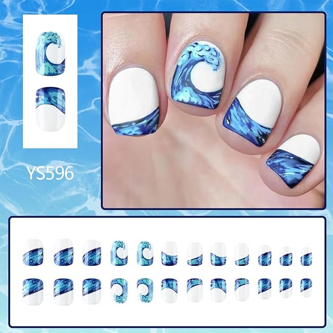 Square Press On Nails Short Fake Nails Summer False Nails With Sea Design Full Cover Acrylic Artificial Nails Glossy Glue On Nails Stick On Nails For Women Manicure 24pcs