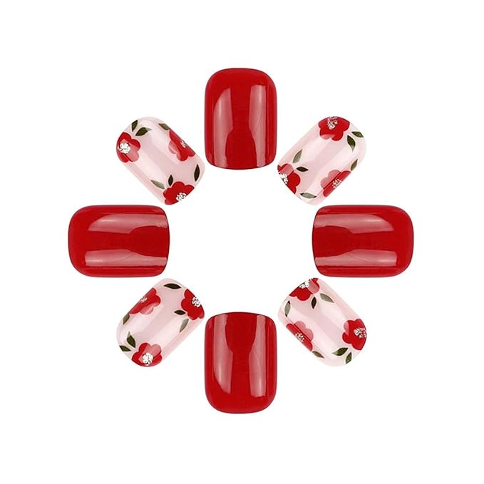 Red Press on Nails Short Square Fake Nails Glitter with Flower Leaf Design Nails Press Ons Floral Full Cover False Nails Acrylic Artificial Nails Glossy Glue on Nails Stick on Nails for Women 24Pcs