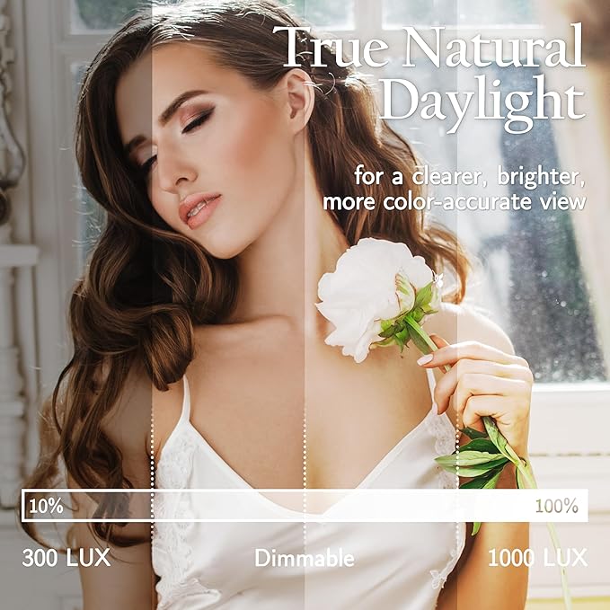 - 【3-Color Lighting & Stepless Dimming】Featuring three adjustable color settings (Cool White, Warm White, Natural White) for diverse makeup environments. Effortlessly slide your finger for precise brightness control (0-100%), ensuring shadow-free, even illumination every time.