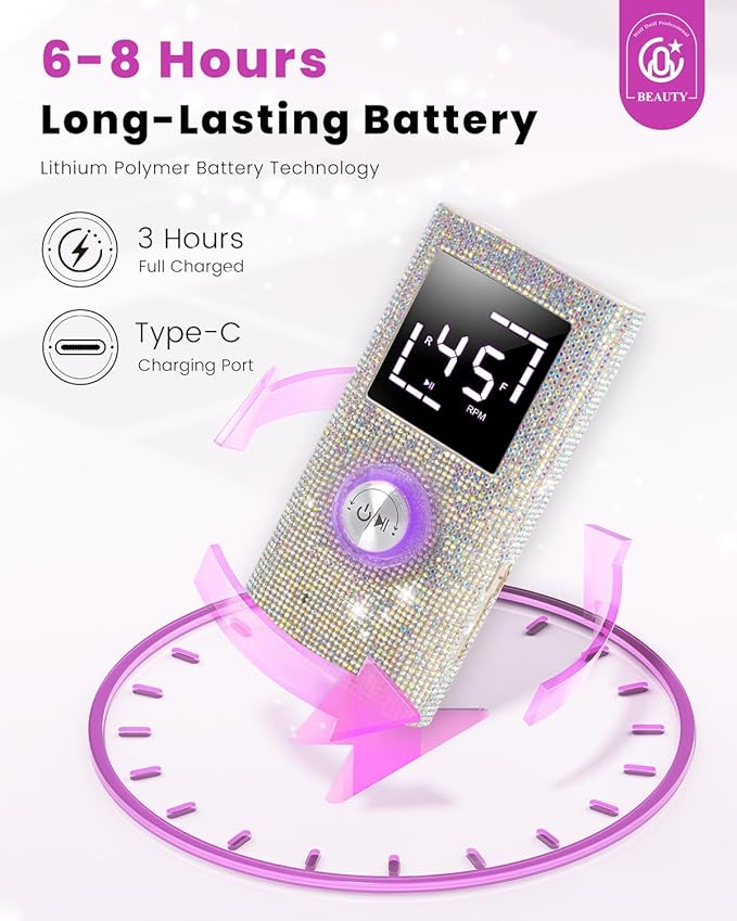 - ๐๐ผ๐ป๐ด-๐๐ฎ๐๐๐ถ๐ป๐ด ๐๐ฎ๐๐๐ฒ๐ฟ๐ ๐๐ถ๐ณ๐ฒ๏ผEquipped with a high-capacity battery, this nail drill offers long-lasting performance, reducing the need for frequent recharging. It charges fully in just 3 hours and provides up to 8 hours of use, making it ideal for both home and salon use. The battery ensures you can complete your manicure or pedicure without interruptions, giving you more time to focus on your work.