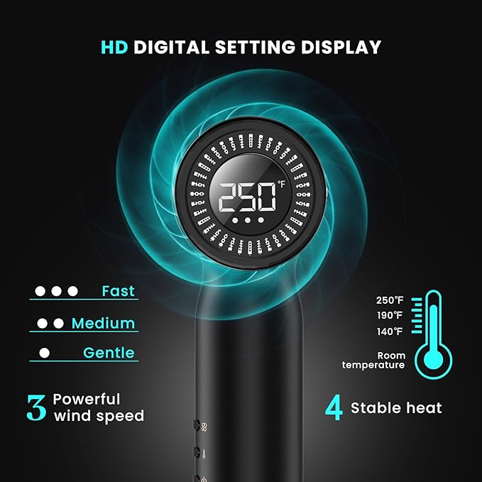 - Intelligent Heat Control to Protect Your Hair : Featuring a smart LCD display with precise temperature and speed settings, you can tailor your styling to suit fragile, color-treated, or fine hair - ensuring gentle drying without compromising on performance.