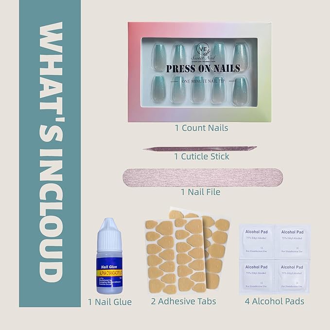- 【 Complete Application Kit Included】 Each set includes a 12.7cm nail file, 3g strong nail glue, 2 adhesive tabs (large and small), 4 alcohol wipes, and a cuticle stick for easy, salon-quality application at home.
