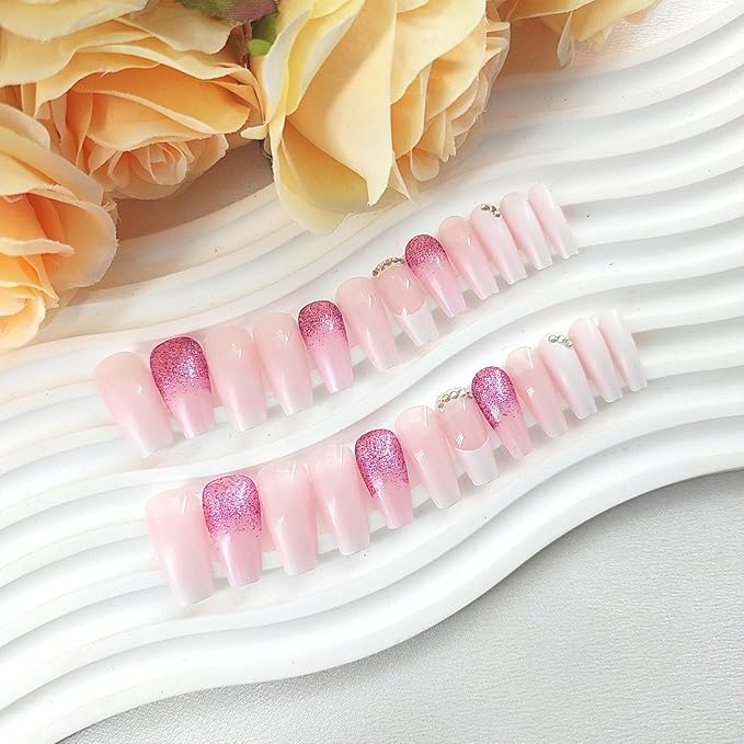 Coffin Press on Nails Medium White French Tip Gradient Fake Nails with Glitter Rhinestones Design False Nails Light Pink Transparent Glue on Nails Glossy Coffin Nails Press ons for Girls 24Pcs