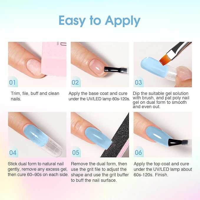 - Warm Tips: It is common for gels to be sticky. so dipping you brush into the gel solution will help you push the gel more smoothly. Or you can seal the gel tube and soak it in warm water before use, which will make it more fluid and help you squeeze out the poly nai gel more smoothly. Both sides of the nail need LED light or UV light to cure for about 120s to completely dry. The lighting time needed depends on the thickness of the gel