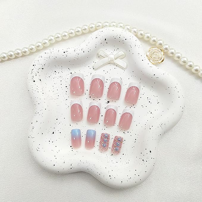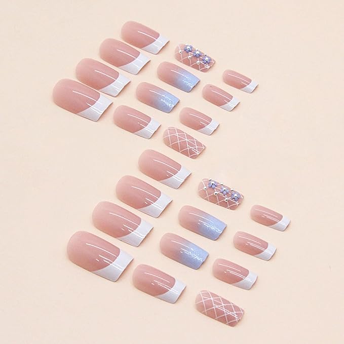 Spring Press on Nails Medium Square Fake Nails with 3D Flower Pearl Designs White French Tip Nails Press ons Glossy Glue on Nails Blue Gradient Acrylic Nails Nude Stick on Nails for Women 24Pcs