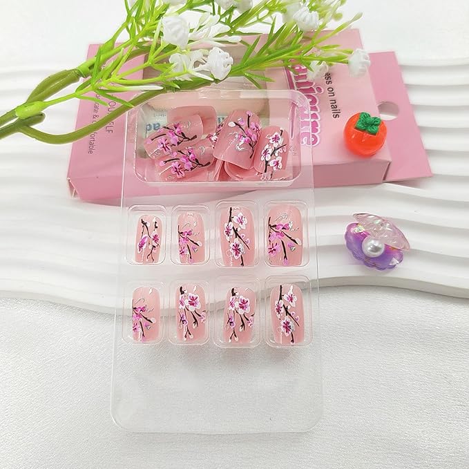 Square Press on Nails Medium Fake Nails with Flower Branches Designs Nude Nails Press ons Glossy Glue on Nails Spring Acrylic Nails Summer False Nails Artificial Stick on Nails for Women 24Pcs