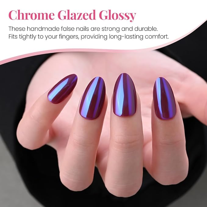 evpct Dark Purple Press on Nails Almond Short, Dark Purple Chrome Glazed Glossy Short Almond Soft Gel Press On Nails with Nail Glue for Women Gift, 15 Sizes 30Pcs Reusable Stick Acrylic Fake Nail Kit