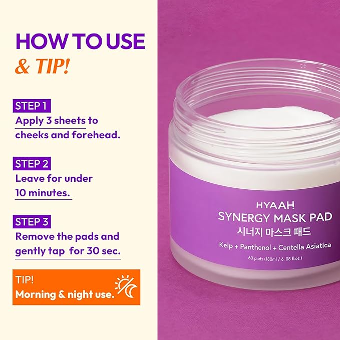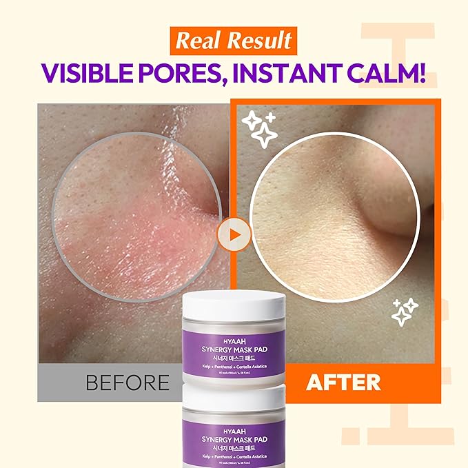 - SYNERGY MASK PAD INNOVATION: HYAAH combines Korean skincare technology with kelp seaweed extract and botanical ingredients in convenient pad format, delivering instant calming care and visible pore refinement in just 20 minutes.
