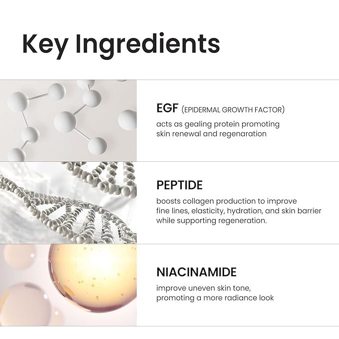 - VISIBLE SKIN RENEWAL – EGF and peptides help improve skin’s texture and elasticity, creating a smoother, more vibrant look.