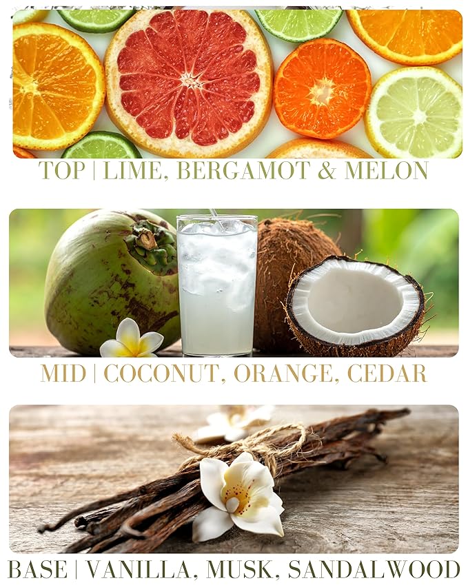 - SCENT PROFILE - Citrus, Fruity, Aromatic, and Woody, TOP: Lime, Bergamot, Melon, MID:Coconut, Orange, Cedar, Peach, Pineapple, BASE: Vanilla, Musk, Sandalwood