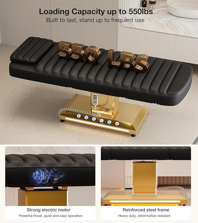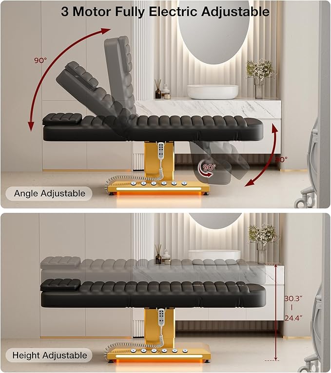 Paddie Professional Fully Electric Spa Chair, 3 Motor Esthetician Spa Bed with LED Light, Motorized Height & Angle Adjustable for Facial & Medical, 550lbs Capacity, Black