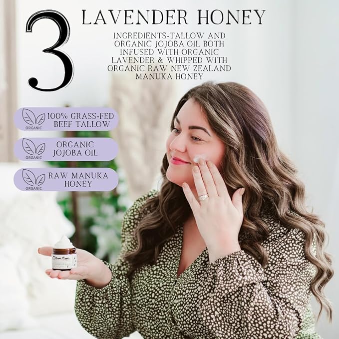 - RICH CREAMY TEXTURE & REFRESHING ORGANIC SCENT: Whipped to a smooth, creamy consistency that absorbs easily into the skin without leaving a greasy residue like most tallow balms. Our tallow is premium and pure, so it doesn't smell of beef like many balms out there! The raw organic Manuka Honey gives the most beautifully sweet scent and combined with organic herbal infusions has redefined what tallow balm can really be! This is what luxury skincare should be, and now you can experience it first hand!