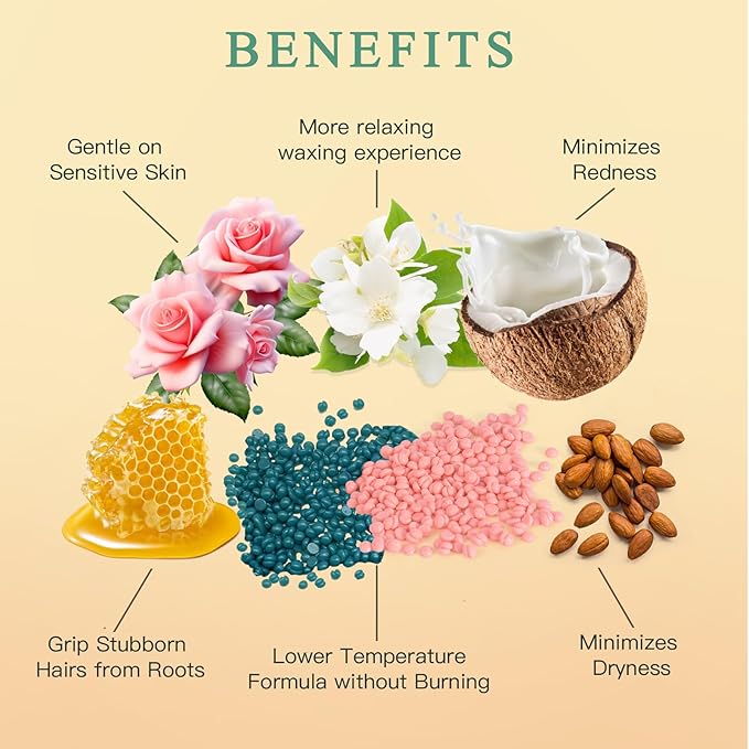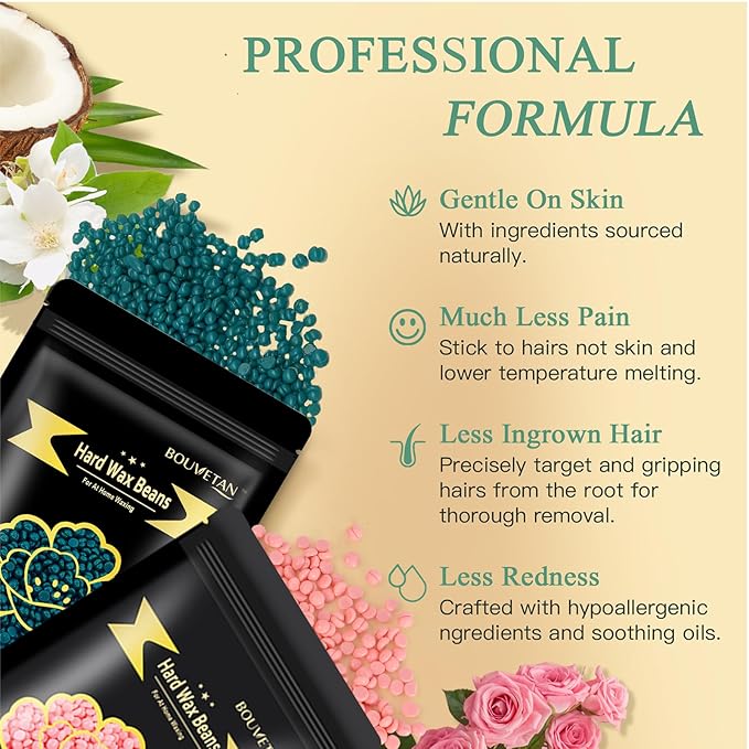 - 【Waxing Beads for Sensitive Skin】BOUVETAN hard wax beans are specifically formulated with hypoallergenic ingredients. They are meticulously designed for sensitive areas hair removal like the bikini line and underarms