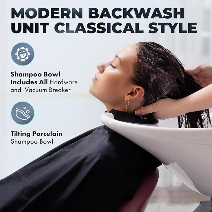 - πππ-ππ-πππ ππππππππ: This complete shampoo backwash unit combines a professional-grade tilting porcelain bowl with a wide tufted chair for seamless salon service. Includes faucet, hose, neck rest, and vacuum breaker, ready to install.