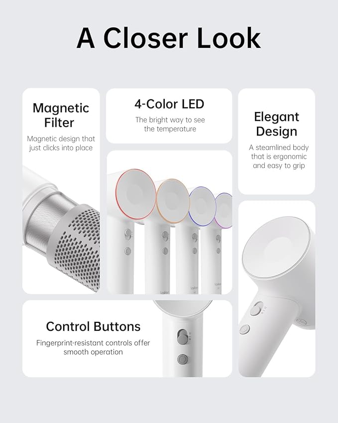 - [Thermo Control Technology] Laifen’s exclusive technology automatically compensates excessive heat, alternating both hot and cold airstreams to avoid hair damage. A thermo-control microprocessor monitors air temperature 50-times per second and makes slight adjustments to keep your hair undamaged by extreme heat.