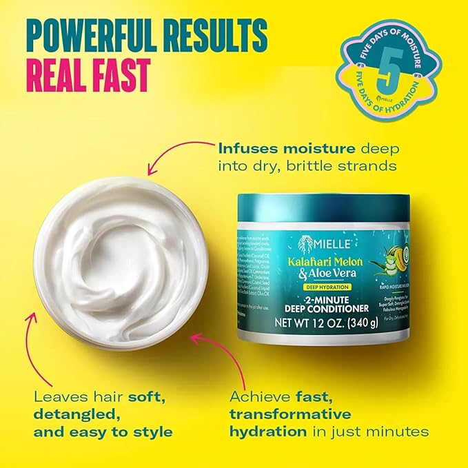 Mielle 2-Minute Deep Conditioner - Kalahari Melon & Aloe Vera Moisturizing Hair Conditioner for Dry, Curly and Textured Hair - Softening, Detangling & Fast-Acting Deep Conditioning Treatment (12 oz)