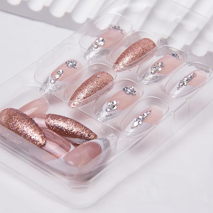 - Glossy & DIY: The french rhinestone nails are just as glossy as salon nails, Pop on your nails with ready-to-wear nails in 3 easy steps without nail polish, UV light, and drying time, helping you achieving a perefect, non-damging manicure within a few minutes