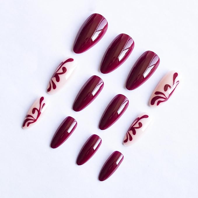 - Safe and Sturdy Design: Unique micro-thickening design to prevent wine red fake nails tips from cracking, they are harmless to humans, children and pets and gentle to your nails and skin. Manual brush gel treatment on the nail surface, pattern printing is clear and not easy to fade, providing you with a safe and comfortable nail experience