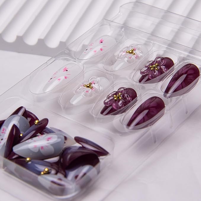 - Glossy & DIY: The 3d flower almond nails are just as glossy as salon nails, Pop on your nails with ready-to-wear nails in 3 easy steps without nail polish, UV light, and drying time, helping you achieving a perefect, non-damging manicure within a few minutes