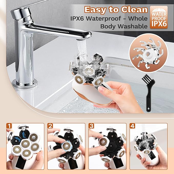 - 【Upgraded 7D Floating Blades】Compared with other 5D floating blades, our 7D wrap-around floating blades allow our lady shaver to automatically adapt to the contours of your hands, legs, head, face, neck and even chin. Providing you with a comfortable and efficient shaving experience. Rounded head design is acne-friendly and perfectly protects skin from nicks and cuts. 360°Gentle, painless and clean hair removal. Note: When using, wipe some water or gel on the skin to shave better.