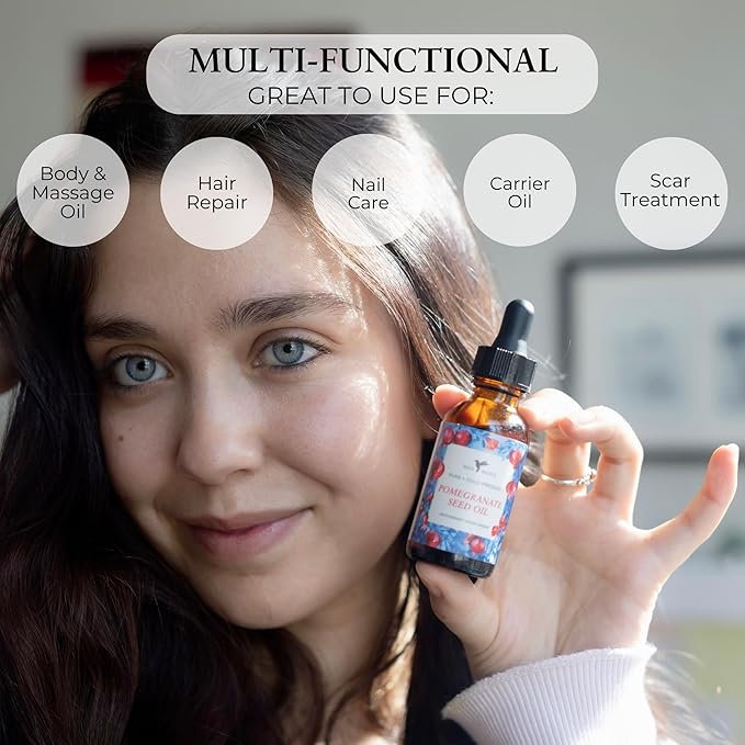 - Ideal for Hair: Our Pomegranate Oil for skin and hair is a natural powerhouse that revitalizes and adds a brilliant shine to your hair. Use it as a scalp treatment to nourish from the root or apply a few drops to split ends to help prevent and repair breakage.