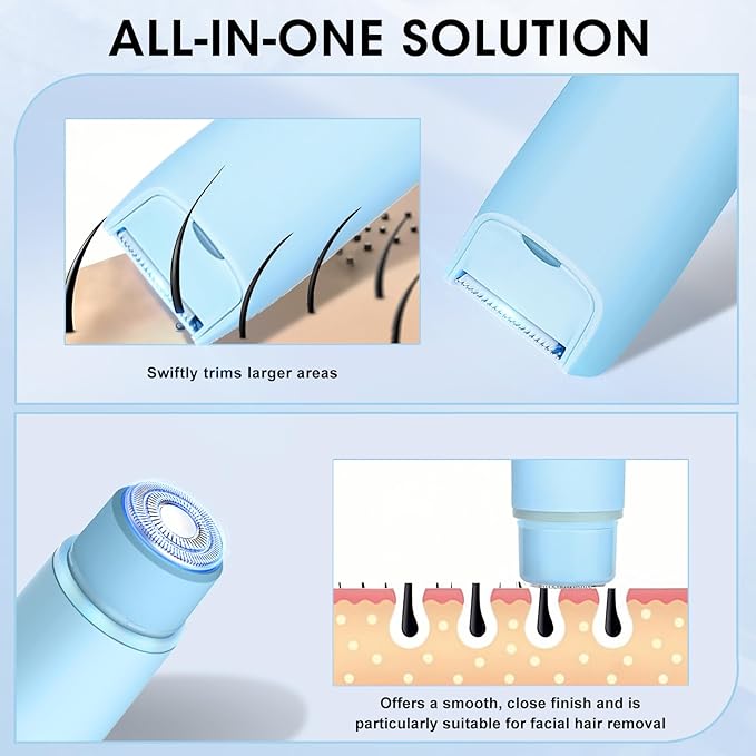 - ✅ Effective & Safe Hair Removal: The bikini shaver head features a top stainless steel blade and a bottom ceramic blade, which makes it sharp, hypoallergenic, and not easy to be damaged, good at dealing with the long body hair (eg. bikini, armpit). The facial hair trimmer head floats with your skin and fit your body contour for a close, precise shave with no irritation, designed for removing short or fine hair (eg. face, lips)