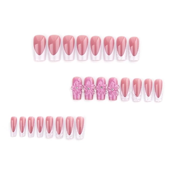 French Press on Nails Medium Long Pink Fake Nails Square Bling Glossy 3D Flower Design False Nail Tips Artificial Nails Finger Manicure for Women and Girls-24pcs