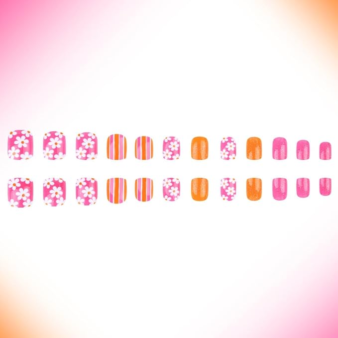 Flower Press on Nails Short Square Fake Nails Colorful Glitter Design Acrylic Nails Spring Summer Flowers False Nail Tips Cute Floral Glue on Nails Reusable Stick on Nails for Women and Girls 24Pcs