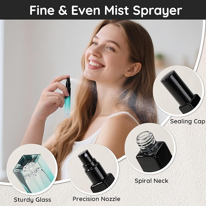 - Fine Mist Atomizer: With the utilization of high precision nozzle, these perfume bottles provide a fine and even mist spray, it is great for dispensing perfume