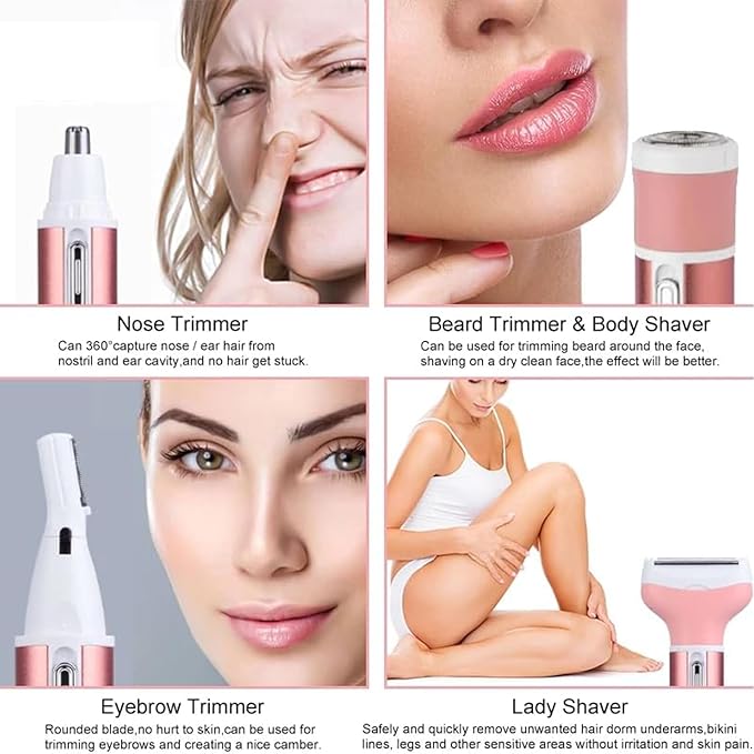 4-in-1 Electric Razor for Women - Painless Facial Hair Removal, Bikini Trimmer, Eyebrow & Body Groomer - Rechargeable Hair Clippers Set for Underarms, Legs & Nose