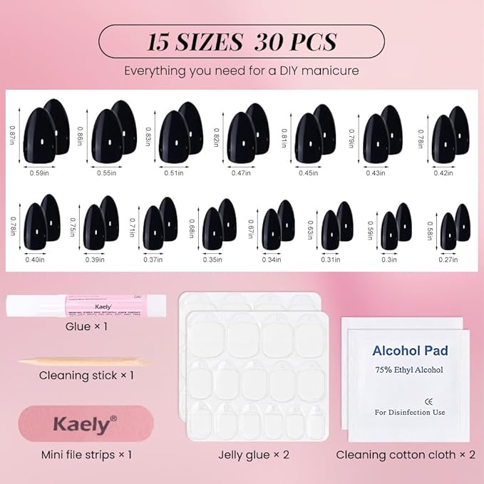 - 【Total 30 Nails with 15 Sizes】15 sizes to choose from, find the perfect fit for your nail beds. Enough accessories in it also. A snazzy storage box to keep nails organized and looking fresh. A handy bottle of nail glue for a snug, long-lasting fit. A double-sided nail file for smooth edges. A cuticle stick to keep cuticles in check. Alcohol pads to prep nails for application. Give yourself a chic, salon-quality manicure right at home