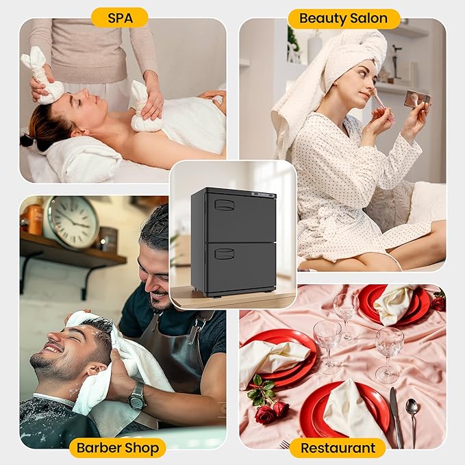 - Extra Large Capacity: 46L high capacity with two cabinets, fits 40 facial-sized (small, washcloth) towels or 20 regular size towels per cabinet, suitable for business use including spa, beauty salon, barber shop, massage room, hotel, etc