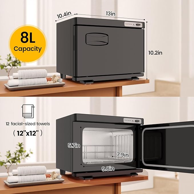 - 8L Capacity: The compact yet efficient hand towel warmer ensures quick heating. It holds 10 normal towels(27*14in) or 12-14 facial-sized towels(12*12in)