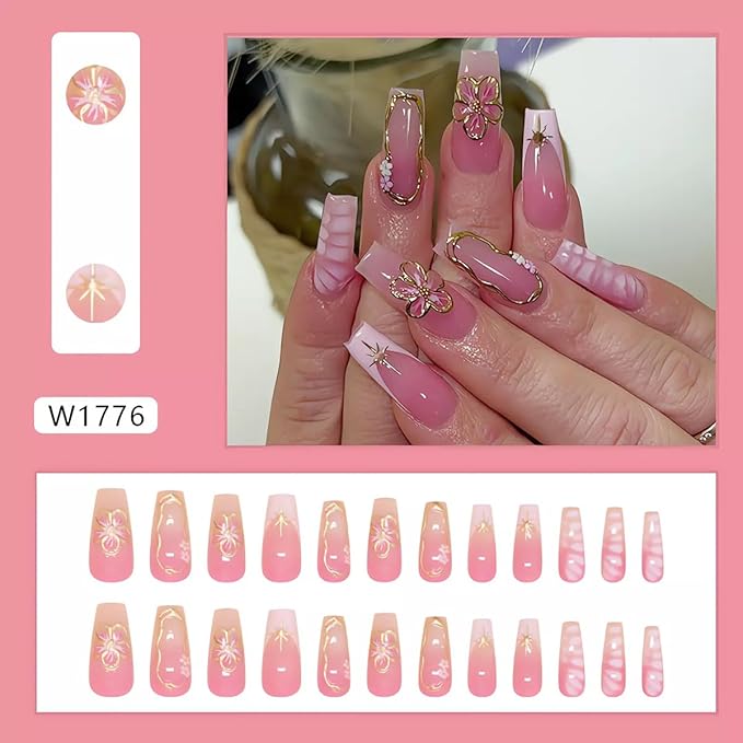 Long Square Press on Nails with Gold Floral Designs Glossy Pink Fake Nails Golden Stars Glue on Nails Gradient French Tip Stick on Nails 3D Flower Artificial Nails for Women Girls, 24Pcs