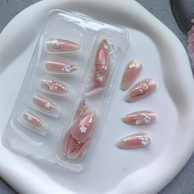24Pcs Almond Press on Nails Medium Stiletto Fake Nails Flower Butterfly Charms Glue on Nails French Nails Tip False Nails Gradient Pink Stick on Nails Reusable Artificial Acrylic Nails for Women