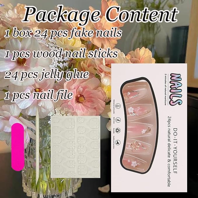 - Flower Nails Set:24Pcs Flower Press on Nails +1 Nail File + 24Pcs Jelly Glue Stickers+1 Wooden Stick.Durability of jelly glue is not as good as liquid glue, but it makes spring fake nails reusable