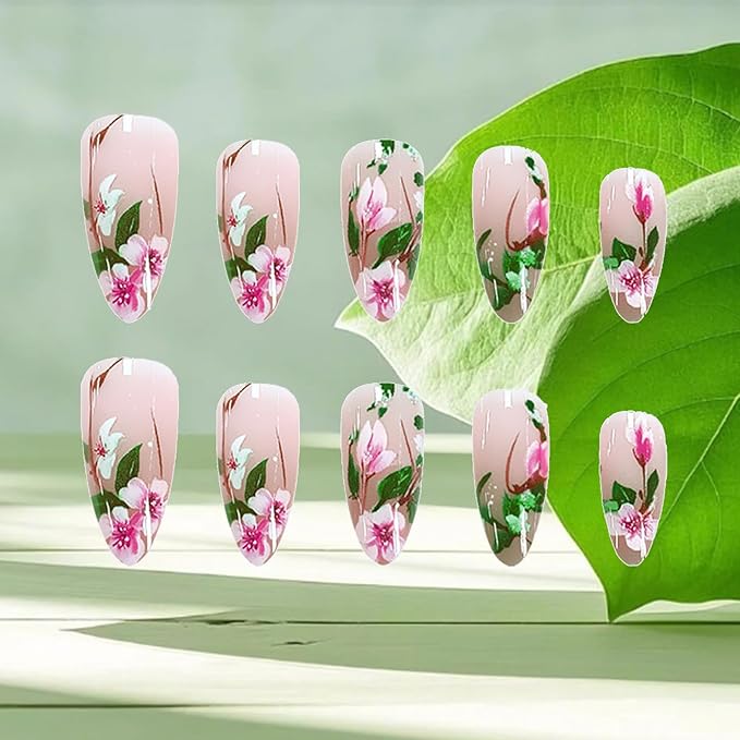 - Fashion for Spring Rose Flower Nails Manicure: Elegant press on nails medium almond contains 12 sizes, total 24 pcs of medium almond nails